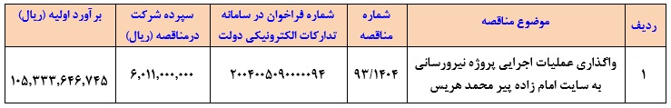 شركت توزيع نيروي برق آذربايجان شرقي در نظر دارد از طريق برگزاري مناقصه عمومي يک مرحله ای نسبت به واگذاری عمليات به شرح جدول ذيل اقدام نمايد.