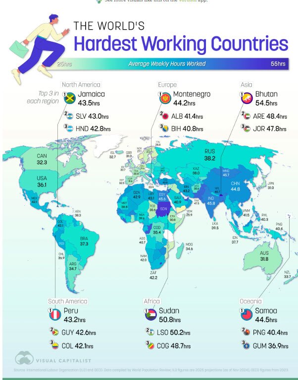 این تصویرسازی بیش از 150 کشور را بر اساس تعداد معمول ساعات کار در هفته در سال 2025 رتبهبندی میکند.