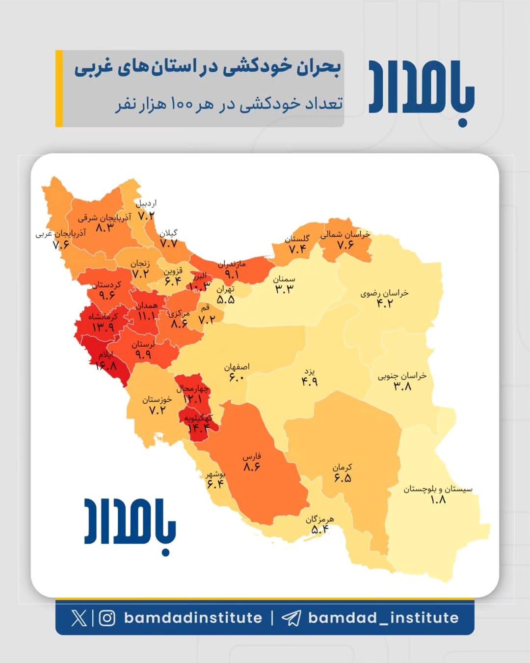 مطابق این گزارش، پراکندگی جغرافیایی موارد خودکشی نیز الگوی نگران‌کننده‌ای را آشکار می‌کند. استان‌های غربی کشور، به‌ویژه کرمانشاه و ایلام، در سال‌های اخیر بالاترین نرخ خودکشی به ازای هر ۱۰۰ هزار نفر را ثبت کرده‌اند و همچنان در صدر فهرست استان‌های درگیر این پدیده قرار دارند.