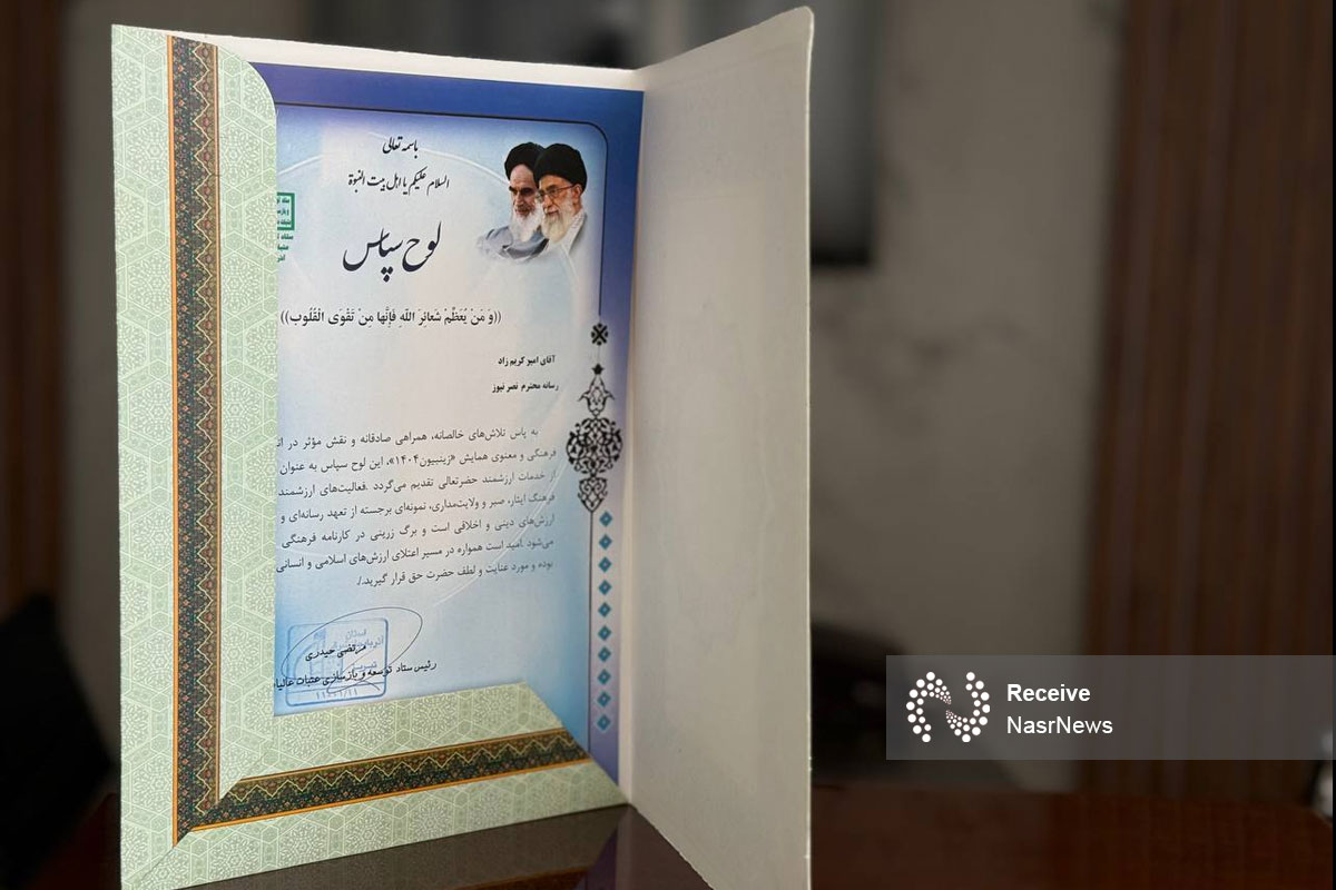 به پاس تلاش های خالصانه، همراهی صادقانه و نقش موثر در انعکاس پیام های فرهنگی و معنوی همایش «زینبیون 1404»، این لوح سپاس به عنوان یادبود و تجلیل از خدمات ارزشمند حضرتعالی تقدیم می گردد. فعالیت های ارزشمند شما در ترویج فرهنگ ایثار، صبر و ولایت مداری، نمونه ای برجسته از تعهد رسانه ای و تلاش برای نشر ارزش های دینی و اخلاقی است و برگ زرینی در کارنامه فرهنگی کشور محسوب می شود. امید است همواره در مسیر اعتلای ارزش های اسلامی و انسانی موفق و منصور بوده و مورد عنایت و لطف حضرت حق قرار گیرید.