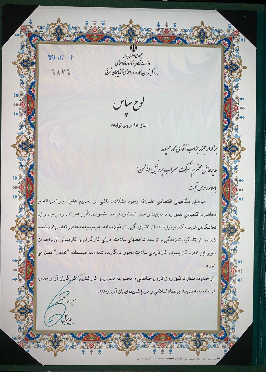 این گزارش می افزاید، در این لوح سپاس که به امضای میر احد حسینی مدیر کل تعاون، کار و رفاه اجتماعی آذربایجان شرقی رسیده ؛ آمده است: