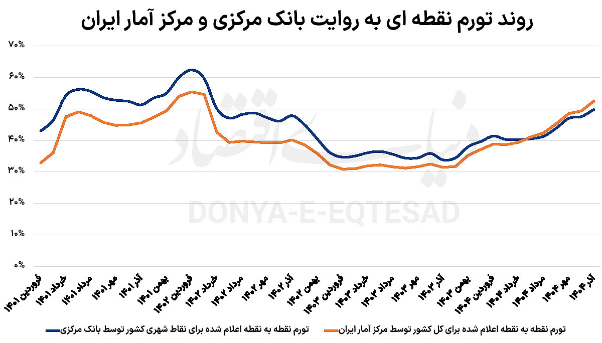 بررسی دادههای منتشرشده توسط مرکز آمار ایران نشان میدهد، تورم در مناطق روستایی کشور در آذر ماه، با اختلافی زیاد، بالاتر از مناطق شهری قرار داشته است. درحالیکه در آذر ماه، تورم نقطهای مناطق شهری توسط مرکز آمار ایران 51.4 درصد ثبت شده، این رقم برای مناطق روستایی، 58.9 درصد گزارش شده است. در تورم ماهانه نیز این موضوع صادق است. مرکز آمار ایران تورم ماهانه مناطق شهری را 4.1 درصد اعلام کرده ولی این رقم برای مناطق روستایی کل کشور، 5 درصد ثبت شده است. آمار تورمی اعلامی توسط بانک مرکزی تنها مربوط به مناطق شهری کشور است و مناطق روستایی را شامل نمیشود. قدمت اعلام آمارهای تورم در بانک مرکزی از مرکز آمار بیشتر است.
