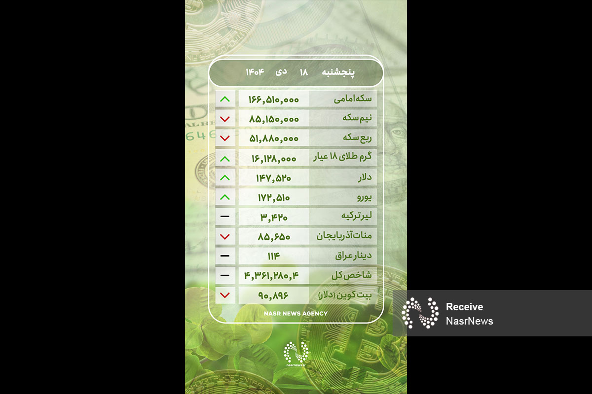 نصر: قیمت انواع طلا و سکه امامی همچنان انواع ارز موجود در بازار تبریز به تاریخ پنجشنبه 18 دی ماه 1404 به شرح زیر است: