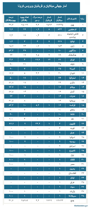 جایگاه ایران در آمار جهانی مبتلایان، قربانیان و بهبودیافتگان ویروس کرونا