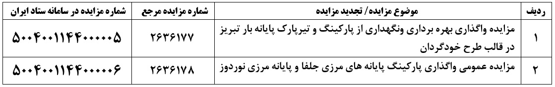 آگهی مزایده عمومی یک مرحله ای واگذاری پارکینگ پایانه های مرزی جلفا و نوردوز و پارکینگ و تیرپارک پایانه بار تبریز نام مزایده گذار: اداره کل راهداری و حمل و نقل جادهای آذربایجان شرقی موضوع آگهی مزایده عمومی واگذاری بهره برداری و نگهداری پارکینگ پایانه بار تبریز غرف تجاری و خدماتی در قالب عقد قرارداد اجاره بدون اخذ سرقفلی با برنده مزایده: