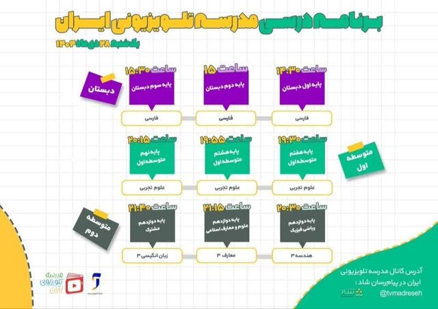 اعلام برنامه درسی مدرسه تلویزیونی برای امروز