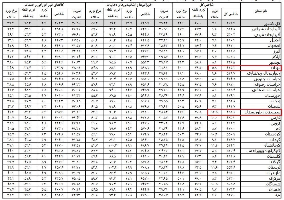 جزییات میزان تورم به تفکیک استان ها