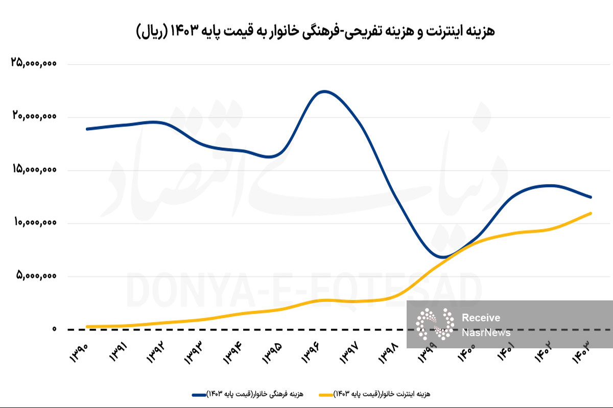 در دادههای مصرف خانوار طی ۱۴سال گذشته یعنی از سال 1390 تا 1403، اینترنت عملا از یک کالای کماهمیت به یک کالای ضروری تبدیل شده است. رشدی که هم از سمت عرضه با گسترش زیرساختها، گوشیهای هوشمند و پلتفرمها اتفاق افتاده و هم از سمت تقاضا با توسعه کسبوکارهای دیجیتال، آموزش، سرگرمی و ارتباطات تغذیه شده و بهتدریج سبد فرهنگی و تفریحی خانوار را بازآرایی کرده است. مصرف اینترنت از ابتدای دهه 90 تاکنون بیش از 30برابر شده است. همزمان، مصرف بسیاری از کالاها و خدمات فرهنگی و تفریحی سنتیتر مثل کتاب، سینما و برخی سرگرمیهای حضوری 35درصد یافته کاهش است. این کاهش صرفا به معنای مصرف کمتر خدمات فرهنگی نیست، بلکه نشانه تغییر شیوه مصرف است. بخشی از خدمات فرهنگی از طریق سرگرمی، یادگیری، تعامل اجتماعی و حتی هویتیابی در بستر اینترنت تامین میشود و اینترنت در این دوره برای طیفی از اقلام فرهنگی و تفریحی نقش جانشین پیدا کرده است.