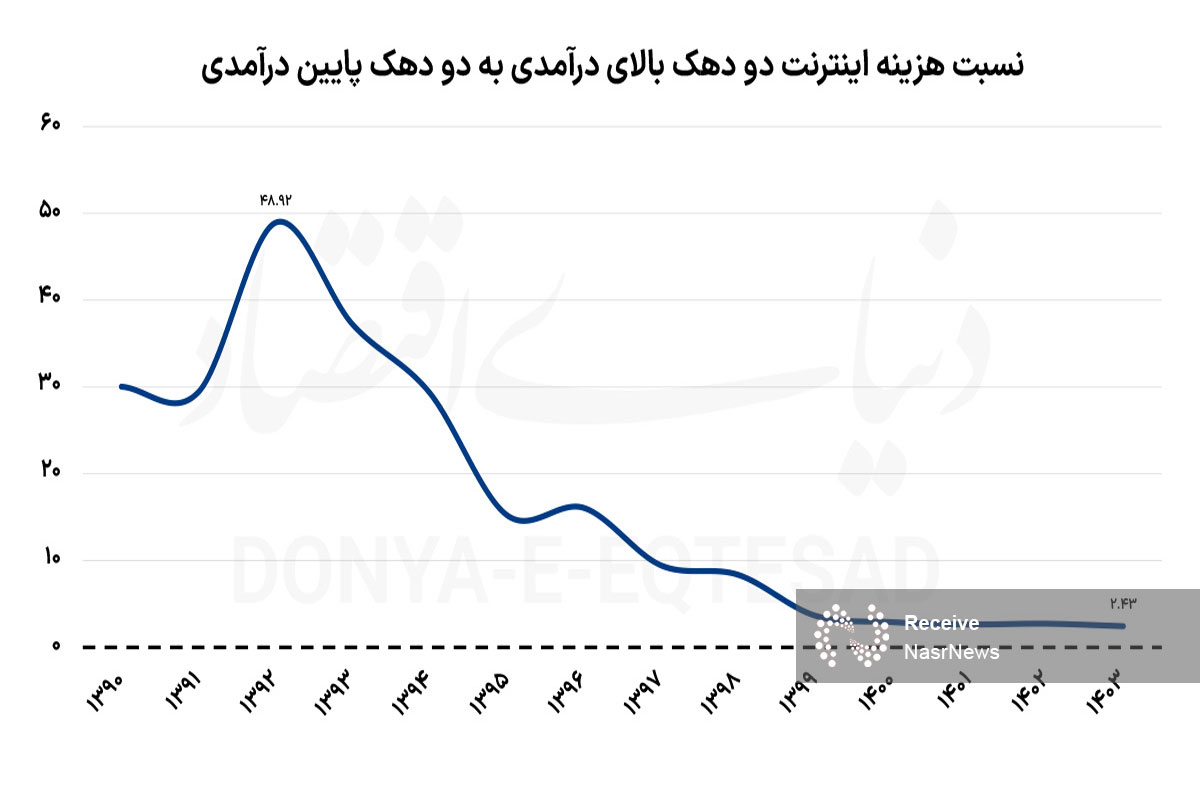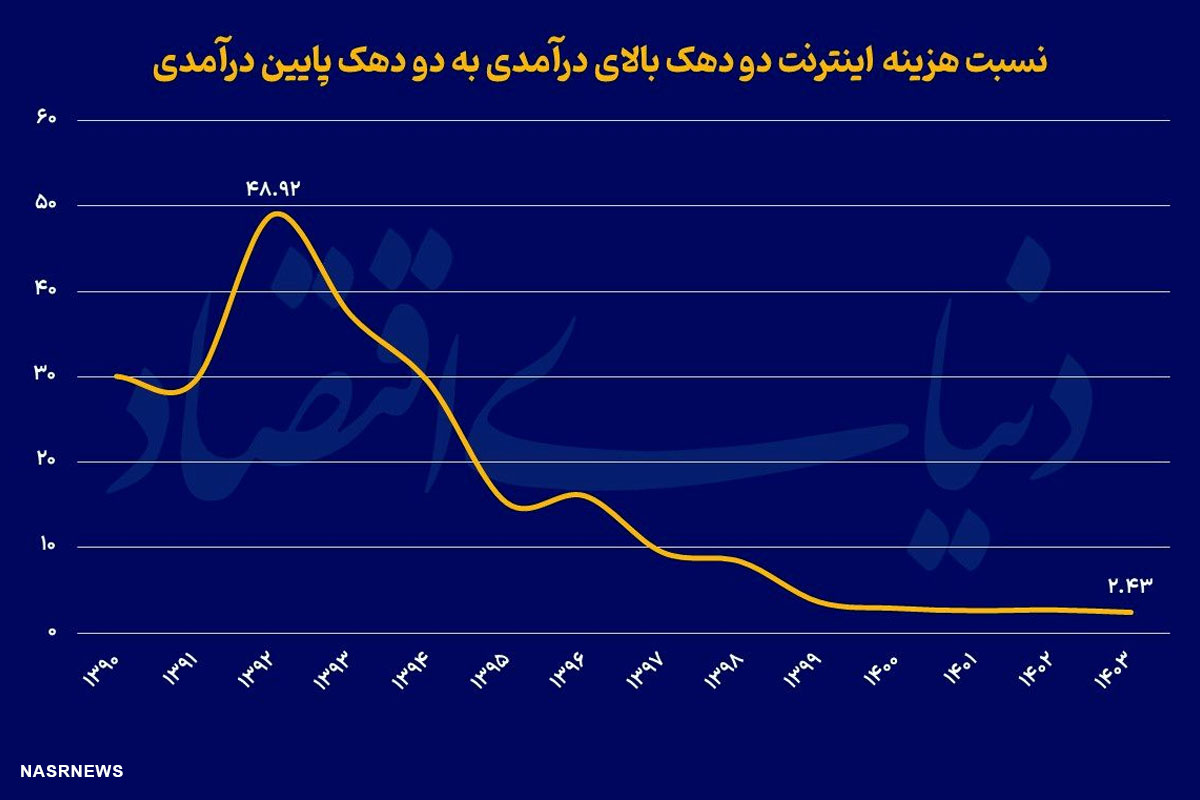 به گزارش نصر، بررسیهای «دنیایاقتصاد» نشان میدهد نسبت مصرف اینترنت دو دهک بالای درآمدی به دو دهک پایین از ۴۸برابر در سال۱۳۹۲ به ۲.۴برابر در سال۱۴۰۳ رسیده و فاصله هزینه اینترنت خانوار شهری و روستایی نیز از ۱۰.۸برابر به ۱.۶برابر کاهش یافته است. در عینحال مصرف اینترنت از سال۱۳۹۰ تا ۱۴۰۳ حدود ۳۰برابر افزایش یافته، درحالیکه مصرف سایر کالاها و خدمات فرهنگی و تفریحی در همین دوره با افت ۳۵درصدی مواجه بوده است. این روند نشان میدهد اینترنت بهتدریج جایگزین دیگر خدمات فرهنگی و تفریحی شده و با گسترش ضریب نفوذ آن در سراسر کشور، ضمن افزایش وابستگی عمومی به اینترنت، به کاهش شکاف فرهنگی و شکلگیری نوعی همگرایی ذهنی میان شهر و روستا و همچنین میان فقیر و غنی انجامیده است. در این شرایط قطع اینترنت اثر فراگیری در رفتار همه خانوارها دارد.