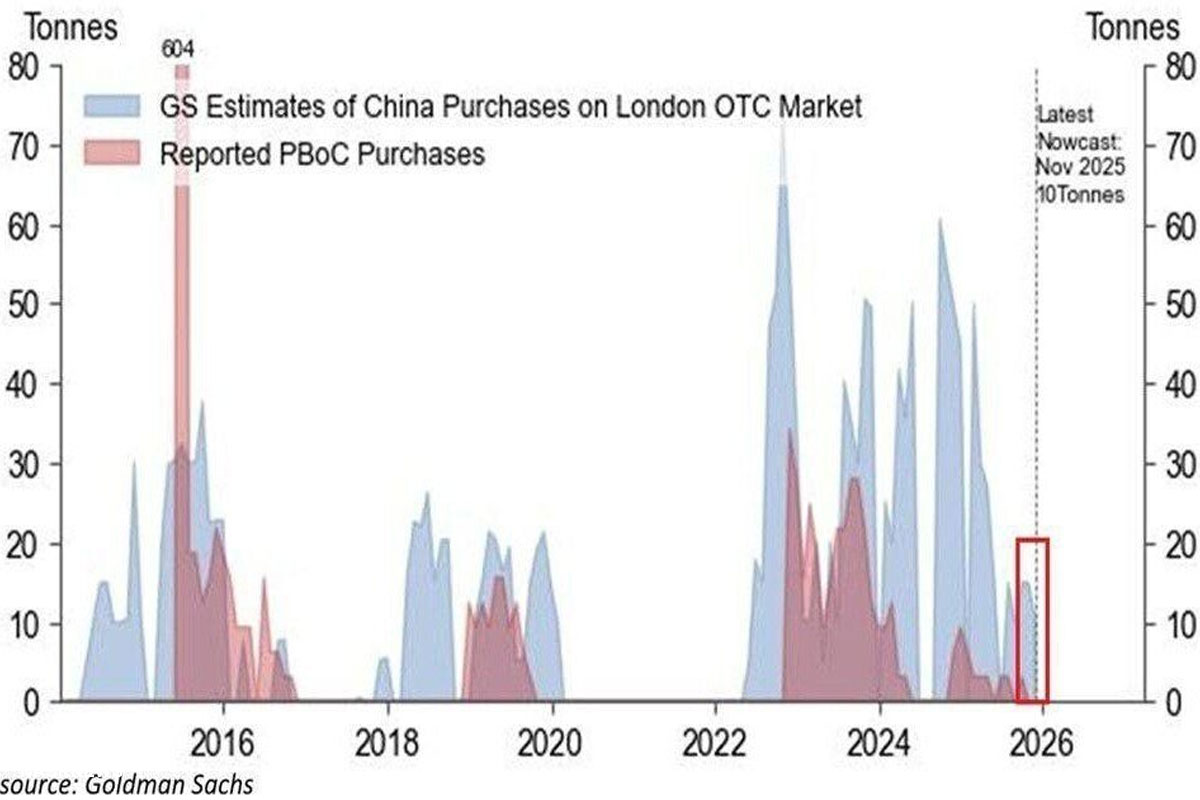 بر اساس برآوردهای گلدمن ساکس، چین در ماه نوامبر بیش از ۱۰ تن طلا خریداری کرده است که این مقدار تقریباً ۱۱ برابر بیشتر از آن چیزی است که بهطور رسمی توسط بانک مرکزی چین اعلام شده است، همچنین در سپتامبر، خریدهای چین به بیش از ۱۵ تن رسیده که ۱۰ برابر بیشتر از گزارشهای رسمی بوده است، این میزان خرید بهطور غیررسمی به یکی از محرکهای اصلی افزایش قیمت طلا در بازار جهانی تبدیل شده است.