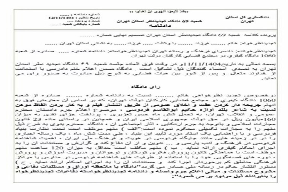 نصر: شعبه ۶۹ دادگاه تجدیدنظر استان تهران، یک بلاگر شناخته‌شده را به اتهام توهین به حکیم ابوالقاسم فردوسی محکوم کرد.