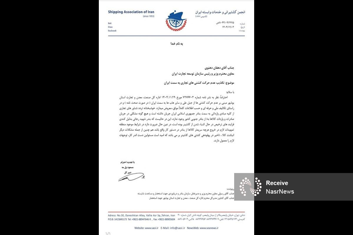 به گزارش نصر، در متن نامه مسعود پل مه، دبیر انجمن کشتیرانی ایران به رئیس سازمان توسعه تجارت آمده است: