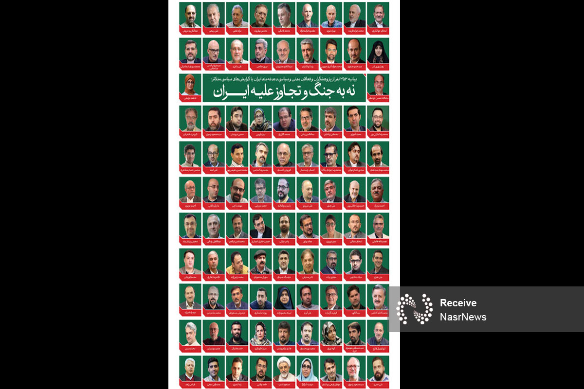 به گزارش نصر، ۳۵۳ نفر از «پژوهشگران، فعالان مدنی و سیاسی و دغدغهمندان ایران» با طیف وسیعی از گرایشهای متکثر بیانیهای با عنوان «نه به جنگ و تجاوز علیه ایران» امضا و منتشر کردهاند و از عموم شهروندان دعوت کردهاند صدایشان علیه جنگ و تجاوز به ایران را بلند کنند.