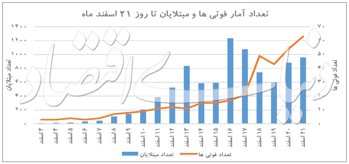 بر اساس آمارها در روز ۲۱ اسفند تعداد فوتیهای روزانه به رقم ۶۳ نفر رسید. این رقم بیشترین سطح گزارششده طی یک روز از ابتدای انتشار آمارها بوده است. رقمی که در روز ۲۰ اسفند ماه ۵۴ نفر گزارش شده بود و حکایت از افزایش ۷/ ۱۶ درصدی در یک روز دارد. با توجه به این آمار میزان کل فوتیها ناشی از این بیماری از ابتدای انتشار به رقم ۳۵۴ نفر رسیده است.