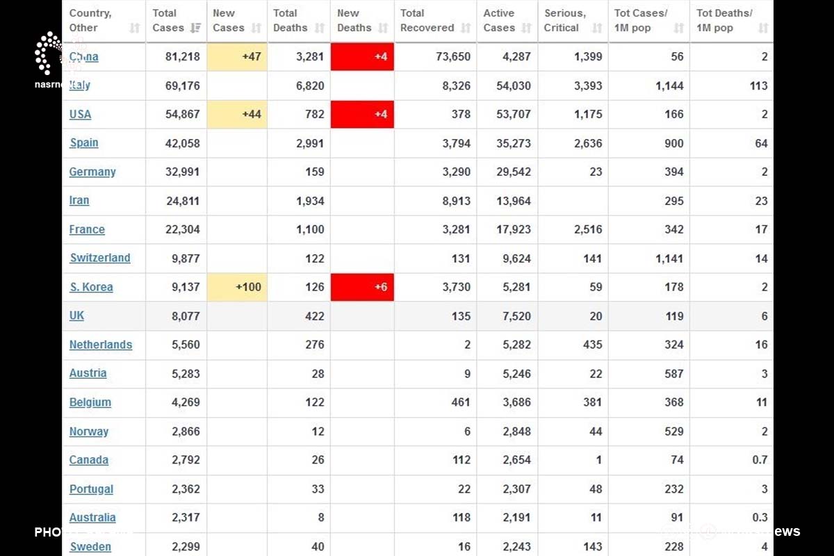 کشور چین بهعنوان مبدأ شیوع این ویروس با 81 هزار و 218 مبتلا در رده نخست جهان قرار دارد؛ بعد از آن کشورهای ایتالیا، آمریکا، اسپانیا و آلمان بهترتیب در ردههای دوم تا پنجم قرار گرفتهاند.