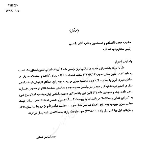 عبدالناصر همتی رئیس بانک مرکزی در نامه ای به سید ابراهیم رئیسی رئیس قوه قضائیه در تاریخ 10 فروردین ماه 1399 و در راستای اجرای تکالیف قانونی محول شده به این بانک مطابق با ماده 4 آیین نامه اجرایی قانون الحاق یک تبصره به ماده 1082 قانون مدنی (مصوب اردیبهشت ماه 77) و برخی قوانین دیگر، شاخص تورم سالانه و ماهانه سال 1398 و سال های قبل را جهت محاسبه میزان مهریه و خسارت تاخیر تادیه چک اعلام کرد.