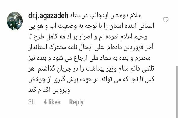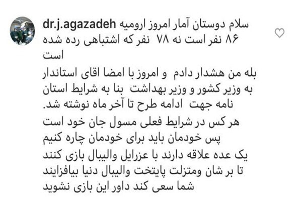 جواد آقازاده در این پست های دلهره آور خود در فضای مجازی ادامه داده است، در ستاد استانی مبارزه با کرونا، آینده استان را وخیم اعلام کردهام، نامه مشترک بنده و استاندار آذربایجان غربی مبنی بر ادامه محدودیتها تا آخر فروردین به ستاد ملی ارجاع شد.