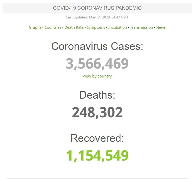 بر این اساس تا لحظه نگارش این خبر سه میلیون و 566 هزار و 469 نفر در سراسر جهان به این ویروس مبتلا شدهاند و 248 هزار و 302 نفر نیز بر اثر آن جان خود را از دست دادهاند.