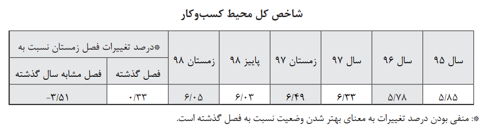 براساس نتایج حاصل از پایش ملی محیط کسبوکار ایران در زمستان ۱۳۹۸، رقم شاخص کل، ۶.۰۵ (نمره بدترین ارزیابی ۱۰ است) محاسبهشده که بدتر از وضعیت این شاخص نسبت به ارزیابی فصل گذشته (پاییز ۱۳۹۸ با میانگین ۶.۰۳) است. همچنین این ارزیابی بیانگر آن است که از دید فعالان اقتصادی مشارکتکننده در این پایش، در اکثر استانها، وضعیت بیشتر مؤلفههای مؤثر بر محیط کسبوکار ایران در زمستان ۱۳۹۸ تا حدودی نامساعدتر شده است.