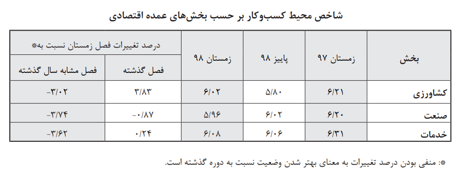 براساس نتایج این پایش در زمستان ۱۳۹۸، وضعیت محیط کسبوکار در بخش خدمات در مقایسه با بخشهای صنعت و کشاورزی نامناسبتر ارزیابیشده است. در بین رشته فعالیتهای اقتصادی، رشته فعالیتهای سایر فعالیتهای خدماتی، اداری و خدمات پشتیبانی و ساختمان به ترتیب دارای بدترین وضعیت کسبوکار و رشته فعالیتهای سایر فعالیتهای هنر، سرگرمی و تفریح، املاک و مستغلات و آموزش به ترتیب بهترین وضعیت کسبوکار را در مقایسه با سایر رشته فعالیتهای اقتصادی در کشور داشتهاند.