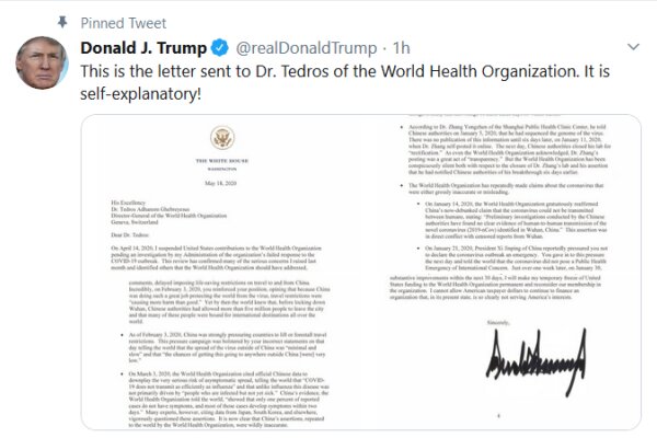 به گزارش نصر به نقل از مهر، دونالد ترامپ رئیس‌جمهور آمریکا در صفحه توئیتر خود نسخه‌ای از نامه ارسالی به «تدروس آدهانوم» رئیس سازمان بهداشت جهانی را منتشر کرد که حاکی از تداوم سیاست خصمانه واشنگتن در قبال این نهاد است.