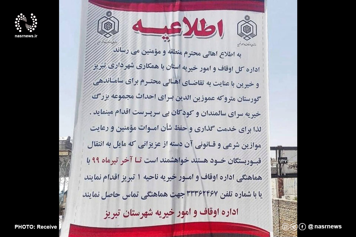 «به اطلاع اهالی محترم منطقه و مومنین میرساند، اداره کل اوقاف و امور خیریه استان با همکاری شهرداری تبریز و خیرین با عنایت به تقاضای اهالی محترم برای ساماندهی گورستان متروکه «عمو زینالدین» برای احداث مجموعه بزرگ خیریه سرای سالمندان و کودکان بیسرپرست اقدام میکند. لذا برای خدمتگزاری و حفظ شان اموات مومنین و رعایت موازین شرعی و قانونی آن دسته از عزیزانی که مایل به انتقال قبور بستگان خود هستند تا آخر تیر با هماهنگی اداره اوقاف ناحیه ۱ تبریز اقدام کنند.»