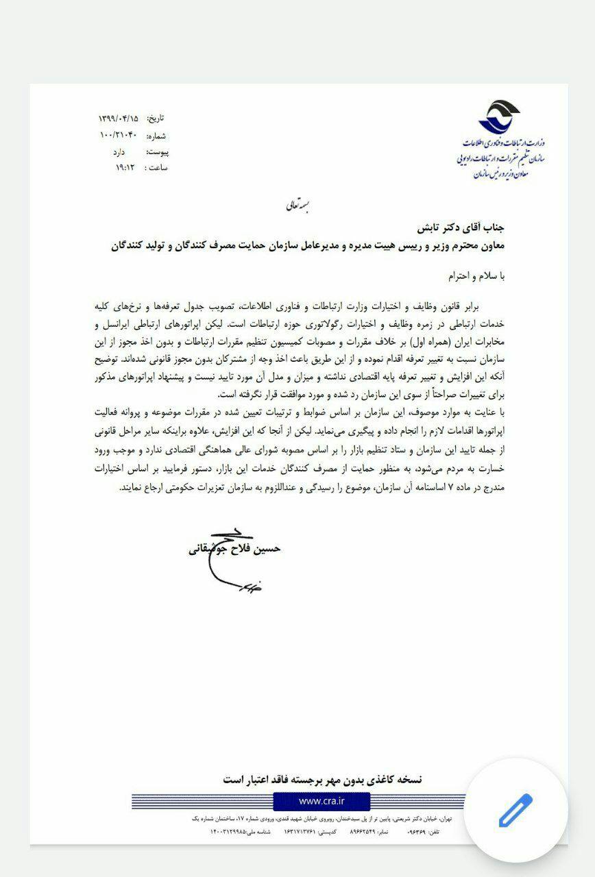 رگولاتوری در این نامه یادآور شده است که افزایش و تغییر تعرفهای که این دو اپراتور نسبت به آن اقدام کردهاند پایه اقتصادی نداشته و میزان و مدل آن نیز مورد تایید این سازمان نیست.