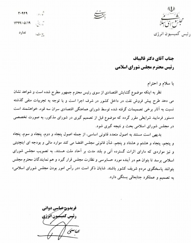 نظر به این که موضوع گشایش اقتصادی از سوی رئیس محترم جمهور مطرح شده است و شواهد نشان میدهد طرح پیش فروش نفت در داخل کشور در شرف اجراست و با توجه به تجربیات منفی گذشته نسبت به آثار برخی تصمیمات گرفته شده توسط شورای هماهنگی اقتصادی سران سه قوه، خواهشمند است دستور فرمایید شرایطی مقرر گردد که موضوع قبل از تصمیمگیری در شورای مذکور، به صورت تخصصی در مجلس شورای اسلامی بحث و نتیجهگیری شود.