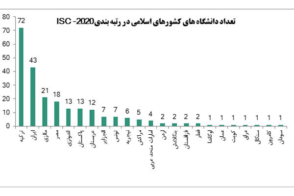در رتبه بندی سال ۲۰۱۹ ISC از نظر تعداد دانشگاهها، ترکیه با ۷۲ دانشگاه بیشترین تعداد حضور را داشته است. در بین سایر کشورهای اسلامی، ایران با ۴۳ دانشگاه، مالزی با ۲۱ دانشگاه، مصر ۱۸ دانشگاه، اندونزی و پاکستان هر کدام با ۱۳ دانشگاه، عربستان سعودی ۱۲ دانشگاه، الجزایر و تونس هر کدام با ۷ دانشگاه، نیجریه ۶ دانشگاه و مراکش ۵ دانشگاه، عمارات متحده عربی ۴ دانشگاه، لبنان، قطر، اردن، بنگلادش، قزاقستان و قطر هر کدام با ۲ دانشگاه و سایر کشورهای اوگاندا، عمان، کویت، کامرون، عراق، سنگال، سودان و هر کدام با ۱ دانشگاه در این رتبه بندی حضور داشتند.