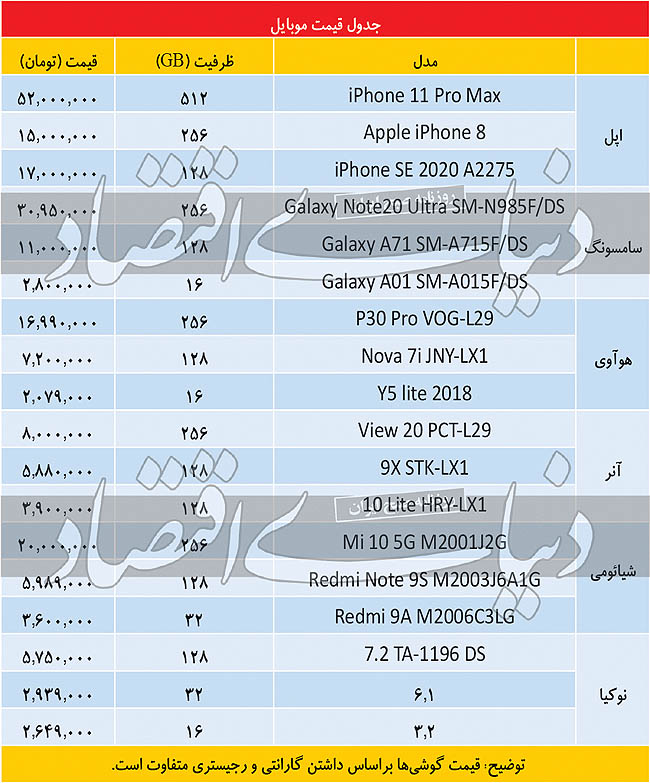 درحالحاضر در بازار موبایل قیمت گوشی آیفون ۱۱ پرومکس با ظرفیت ۵۱۲ گیگابایتی حدود ۵۲ میلیون تومان است. تفاوت قیمتی آن با آیفون ۱۱ پرو نسخه ۵۱۲ گیگابایتی بسیار بالاست و این مدل آیفون حدود ۳۰ میلیون تومان خرید و فروش میشود. ذکر این نکته قابلتوجه است که دیروز اپل اعلام کرد ۲۵ شهریور آیفون ۱۲ رونمایی میشود که بهطور سنتی در زمان رونمایی قیمت گوشیهای قبلیاش را هم کمی ارزان خواهد کرد. در رده گوشیهای سامسونگ نوت ۲۰ اولترا نسخه ۲۵۶ گیگابایتی حول و حوش ۳۰ میلیون تومان خرید و فروش میشود و قیمت یک میانرده سامسونگ یعنی A۷۱ حدود ۱۱ میلیون است. در میان گوشیهای هوآوی P۳۰ Pro کمتر از ۱۷ میلیون و Nova ۷ حدود ۷ میلیون و ۲۰۰ هزارتومان فروخته میشود. گوشی View ۲۰ حدود ۸ میلیون و ۱۰ Lite کمتر از ۴ میلیون است. نسخه ۲۵۶ گیگابایتی گوشی Mi ۱۰ که از گوشیهای پشتیبانیکننده نسل پنجم موبایل است ۲۰ میلیون تومان و Redmi Note ۹S حدود ۵ میلیون و ۹۰۰ قیمت دارند.