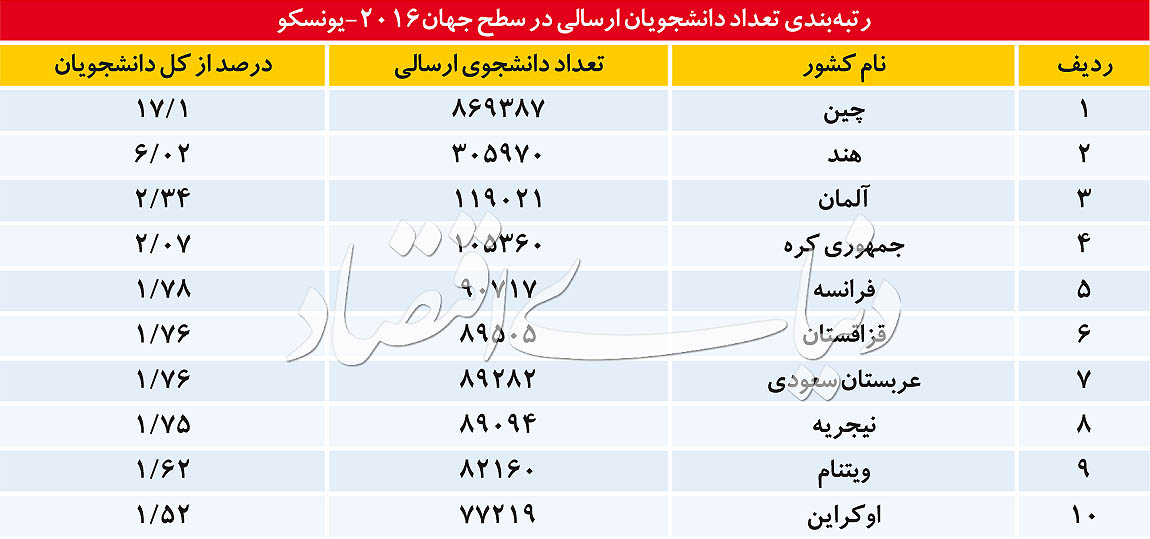 برای شناخت بازار تقاضای دانشجویان بینالمللی میتوان به آمارهای یونسکو مراجعه کرد. طبق آخرین آمار یونسکو که مربوط به سال ۲۰۱۶ است، چین و هند بهعنوان پرجمعیتترین کشورهای جهان و همچنین کشورهایی که بیشترین نرخ رشد اقتصادی را تجربه میکنند و جمعیت قابل توجهی از مردمانشان از زیر خط فقر عبور کردهاند، بیشترین تعداد دانشجویان بینالمللی را به سایر کشورها ارسال میکنند. در جدول، لیست ۱۰ کشور برتر فرستنده دانشجویان بینالمللی و سهم آنها در این بازار را مشاهده میکنید. اما جذابترین بخشموضوع، درآمد کشورهای پیشرو در این بازار از جذب دانشجویان بینالمللی است که در ادامه به برخی از آنها اشاره میشود. براساس اطلاعات منتشر شده در سایت NAFSA در سال تحصیلی ۲۰۱۸-۲۰۱۷، دانشجویان بینالمللی ۳۹ میلیارد دلار به اقتصاد آمریکا کمک و از ۴۵۵۶۲۲ شغل حمایت کردند. در واقع برای هر هفت دانشجوی بینالمللی که ثبتنام میشوند، سه شغل در ایالاتمتحده ایجاد میشود. در سال ۲۰۱۷-۲۰۱۶ حدود دو سوم دانشجویان بینالمللی حاضر در آمریکا بیشتر هزینههای تحصیل خود را از منابعی خارج از ایالاتمتحده دریافت میکردند.