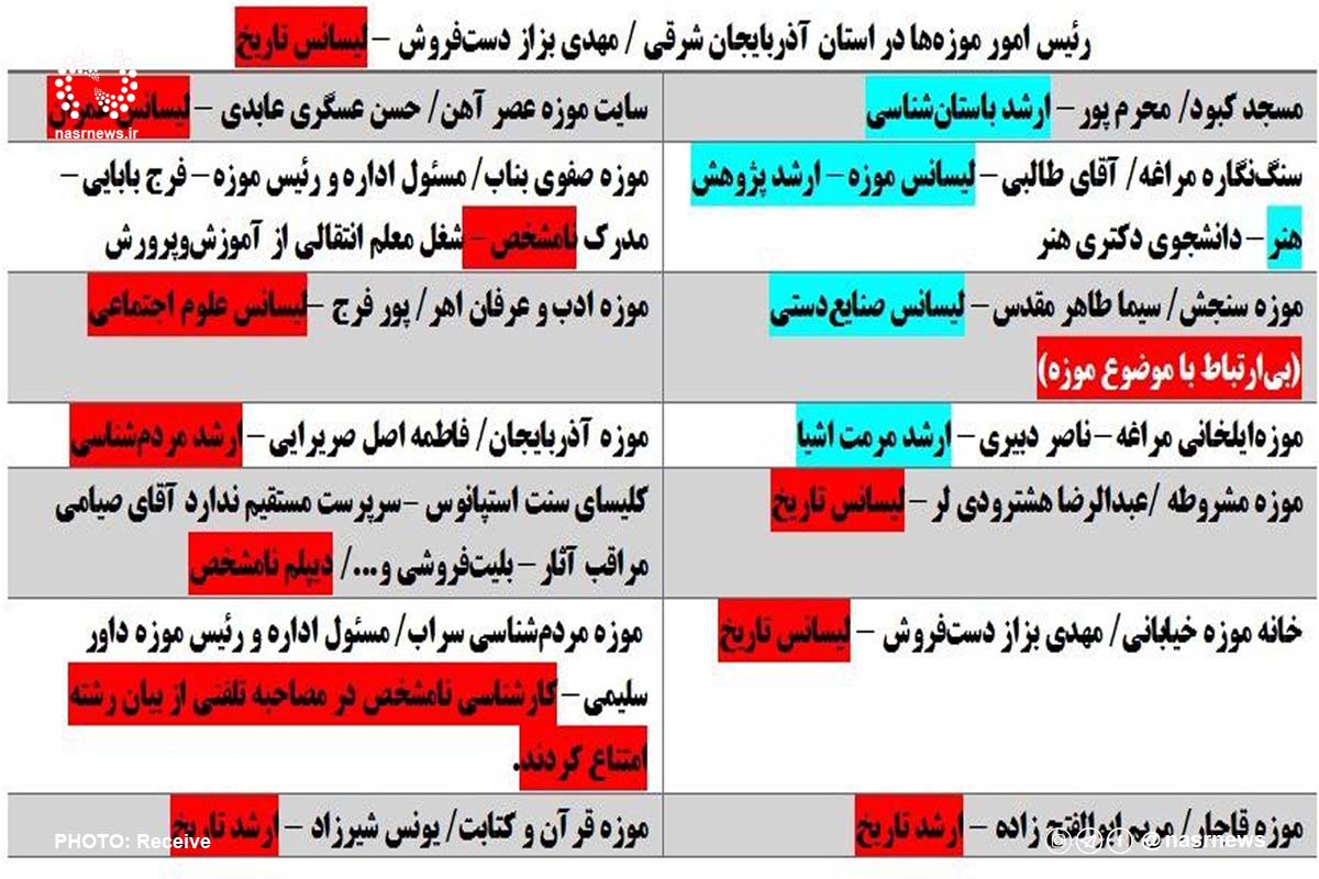 بسیاری از افراد که مسئولیت موزههای آذربایجان شرقی را دارند هیچگونه مدرک مرتبطی با موزه و موزهداری ندارند و درواقع در این امر غیرمتخصص محسوب میشوند.