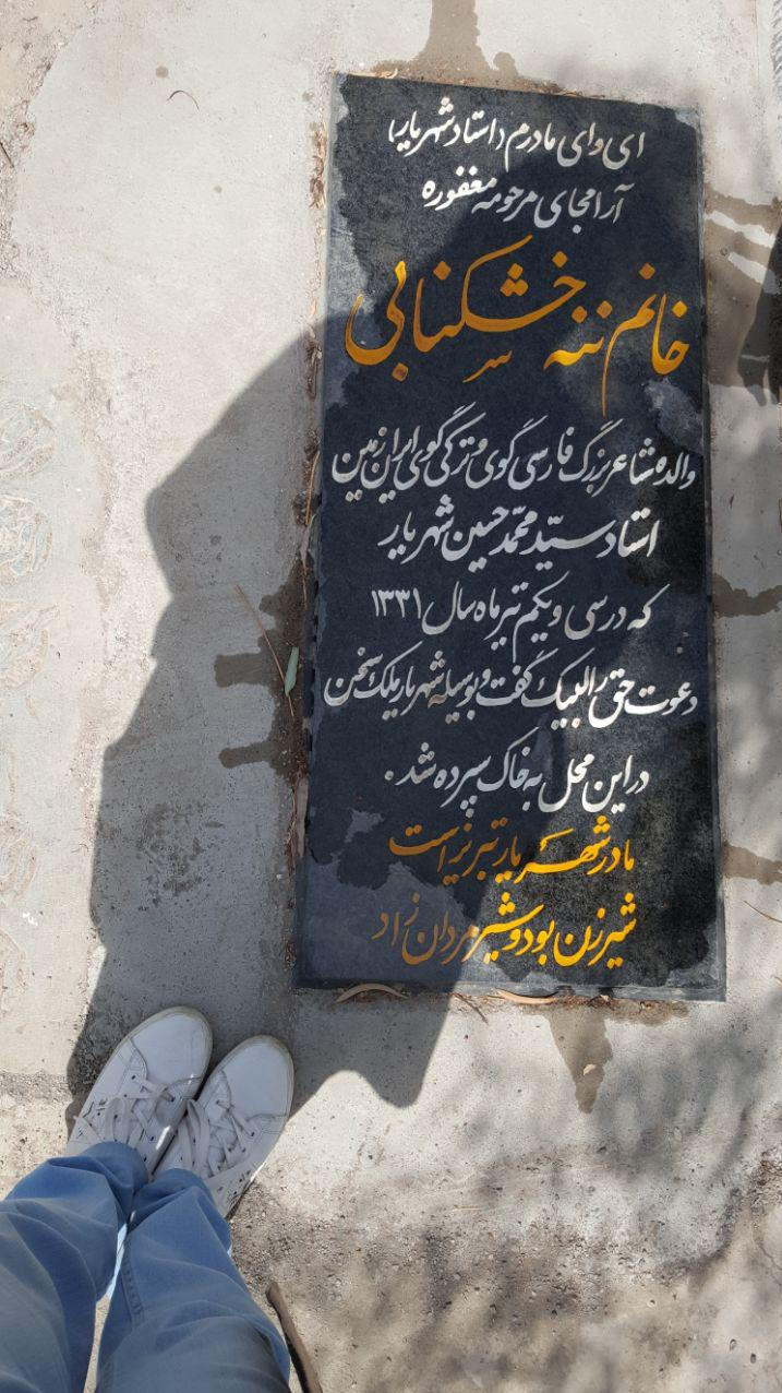 اطراف را نگاه میکنم که ناگهان، نوشتهی طلایی رنگ سنگی سیاه، نگاهم را پر میکند؛ تا به مزار برسم، شعر میخوانم و شعر و شعر؛ سنگ سیاه اما خستگی از تن بیرون میکند؛ اینجا «آرامجای مرحومه مغفوره خانم ننه خشکنابی» است؛ «والده شاعر بزرگ فارسیگوی و ترکیگوی ایران زمین، استاد سید محمدحسین شهریار، که در سی و یکم تیرماه سال 1331 دعوت حق را لبیک گفت و بوسیله شهریار ملک سخن در این محل به خاک سپرده شد.»