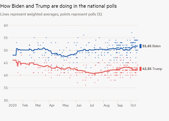 بر اساس گزارش حاصل از نظرسنجی های این روزنامه اقتصادی، در حالی که برای پیروزی در انتخابات 270 رای الکترال لازم است، تا کنون 207 رای برای جو بایدن قطعی به نظر می رسد در حالی که تنها 83 رای قطعی را می توان در حساب دونالد ترامپ قرار داد.