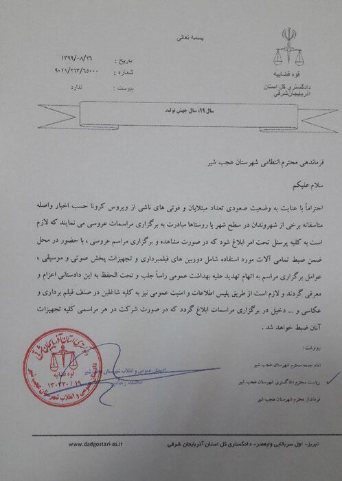 دادستان عمومی و انقلاب عجب شیر گفت: مسوولیت برخورد با هر اقدامی که سلامت شهروندان را به مخاطره بیاندازد با مدعی العموم و دادستانی است و به ضابطین دادگستری نیز طی دستور قضایی ابلاغ شده که در صورت گزارش برگزاری هر گونه تجمع و مراسم، اقدامات لازم را برای جلوگیری از آن انجام دهند.