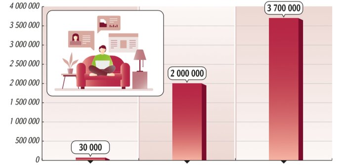 وی گفت: یک سال پیش، ۳۰ هزار نفر رسماً در کشور از راه دور کار می کردند. امروزه اما اکنون، حدود ۶.۵درصد از شهروندان شاغل یعنی ۳.۷ میلیون نفر با این سبک کار می کنند که این ۱۱۰ برابر بیشتر از سال گذشته است.