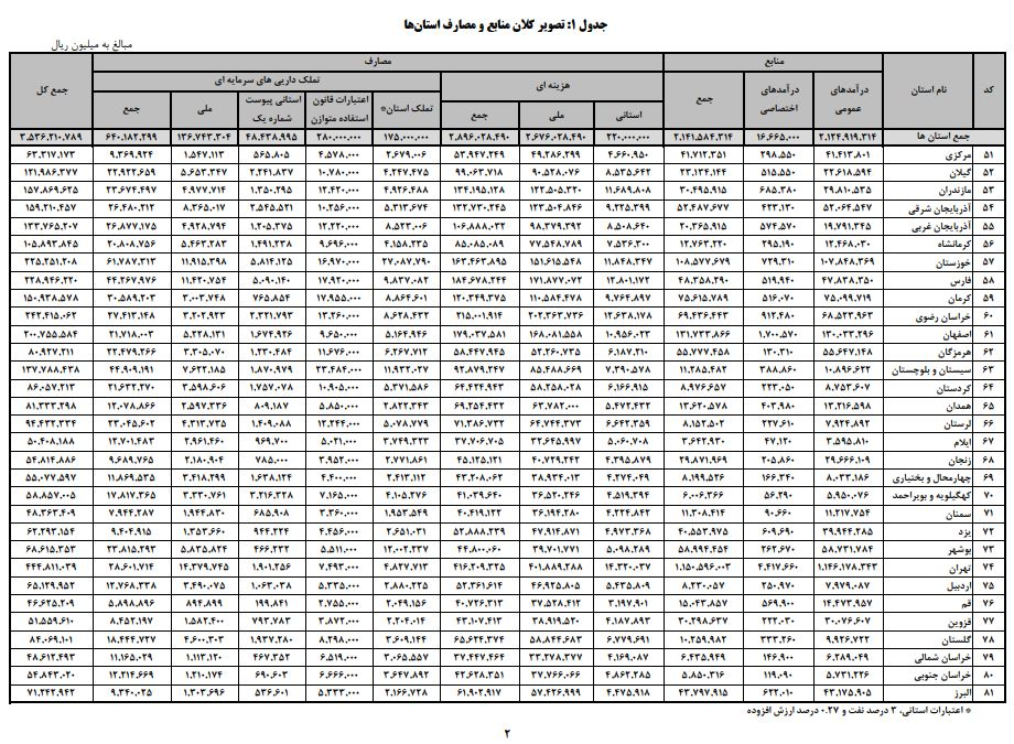 کمترین بودجه استانی متعلق به استان قم با ۴ هزار و ۶۶۲ میلیارد تومان و بیشترین بودجه متعلق به استان تهران با ۴۴ هزار و ۴۸۱ میلیارد تومان برای استان تهران است.