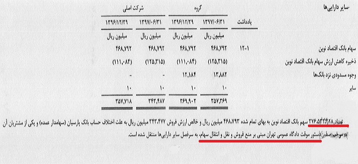 طبق این دستور موقت دادگاه عمومی تهران، فروش و نیز نقل و انتقال این سهام ممنوع شده و به همین خاطر، به سرفصل سایر دارایی ها منتقل شده است.
