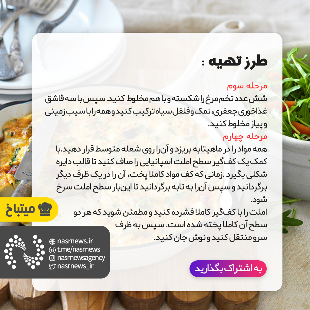 زمانی که کف مواد کاملا پخت، آن را در یک ظرف دیگر برگردانید و سپس آنرا به تابه برگردانید تا اینبار سطح املت سرخ شود.