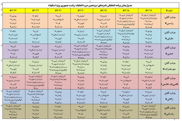 این برنامهها طبق جدول زیر و در روزهای مشخص شده از صدا و سیمای مراکز پخش میشوند. همچنین بر اساس مصوبه ستاد انتخابات معاونت امور استانها، ضمن اختصاص زمان برای تکرار این برنامهها در سیمای استانها، برنامههای تبلیغی نامزدهای سیزدهمین دوره انتخابات ریاست جمهوری از شبکههای رادیویی استانی نیز پخش خواهد شد.