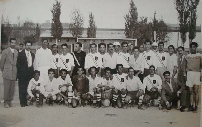 تیمهای سیمرغ و کبریت سازی توکلی(با لباس آرم دار) قبل از بازی دوستانه در میدان دانشسرا – سال 1329- عکس از: عباسقلی رسولی فر
