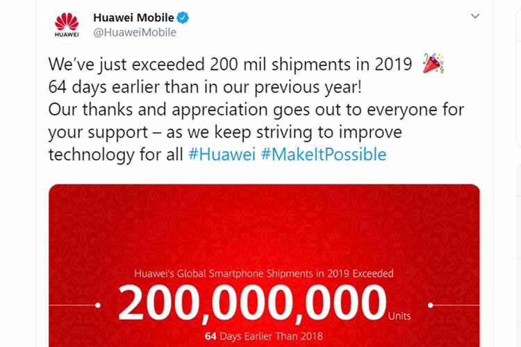 هواوی اعلام کرد، در سال ۲۰۱۹ میلادی، تعداد ۲۰۰ میلیون گوشی هوشمند به مشتریانش در سراسر دنیا فروخته است. هواوی سال گذشته”ی میلادی هم به چنین رکوردی دست پیدا کرد اما تکرار این عدد در شرایط جنگ اقتصادی آمریکا و چین یک دستاورد مهم به شمار می”رود.