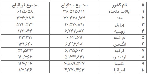 بنابر جدول به روز شده در پایگاه اطلاعرسانی "ورلداُمتر"، شمار مبتلایان و قربانیان این بیماری در ۱۰ کشوری که طبق گزارشهای رسمی بالاترین آمارها را تاکنون داشتهاند تا صبح امروز (دوشنبه) به ترتیب به شرح زیر است: