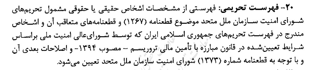 در ماده یک آئین نامه اجرایی قانون مبارزه با پولشویی «فهرست تحریمی» مورد پذیرش کشور را علاوه بر فهرست مصوب شورای عالی امنیت ملی، قطعنامه 1373 شورای امنیت سازمان ملل متحد قرار داده است. این در حالی است که در تمامی قوانین مربوطه مانند قانون مبارزه با تامین مالی تروریسم تنها شورای عالی امنیت ملی به عنوان تنها مرجع صاحب صلاحیت برای تشخیص مصادیق تروریسم و افراد و نهادهای تحریمی معرفی شده اند. به نظر می رسد این اقدام دولت در راستای جلب رضایت FATF صورت گرفته است که منجر به پذیرش فهرست تحریمی نهادهای بین المللی در قوانین داخلی و تبعا پذیرش رسمی خود تحریمی در داخل کشور خواهد شد.