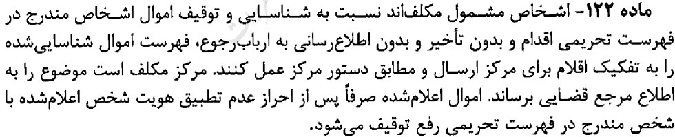 همچنین در ماده 122 این آئین نامه اجرایی از اشخاص داخلی درخواست شده است نسبت به توقیف اموال اشخاص مندرج در «فهرست تحریمی» اقدام کنند.