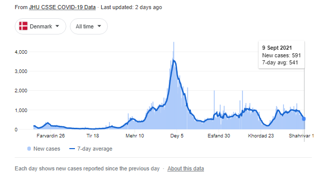 مقامات دانمارک می گویند هم اکنون و بعد از واکسیناسیون، شیوع کرونا تحت کنترل است. در حال حاضر روزانه حدود 500 نفر در دانمارک به کرونا مبتلا می شوند و میانگین انتقال این ویروس 0.7 است.