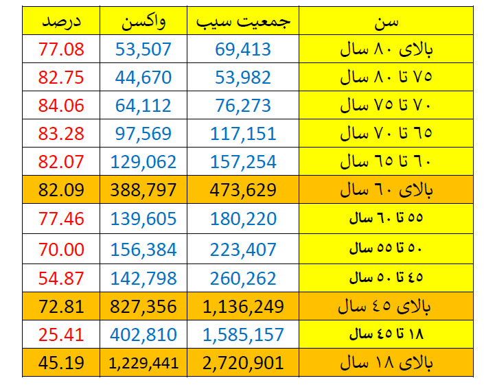 وی با بیان اینکه درصد پوشش تزریق واکسن در استان به 45.5 درصد جامعه هدف رسیده است افزود: استقبال مردم از تزریق واکسن فوق العاده بوده و خوشبختانه درصد بسیار بالایی از جمعیت بالای 60 سال استان را پوشش داده ایم.