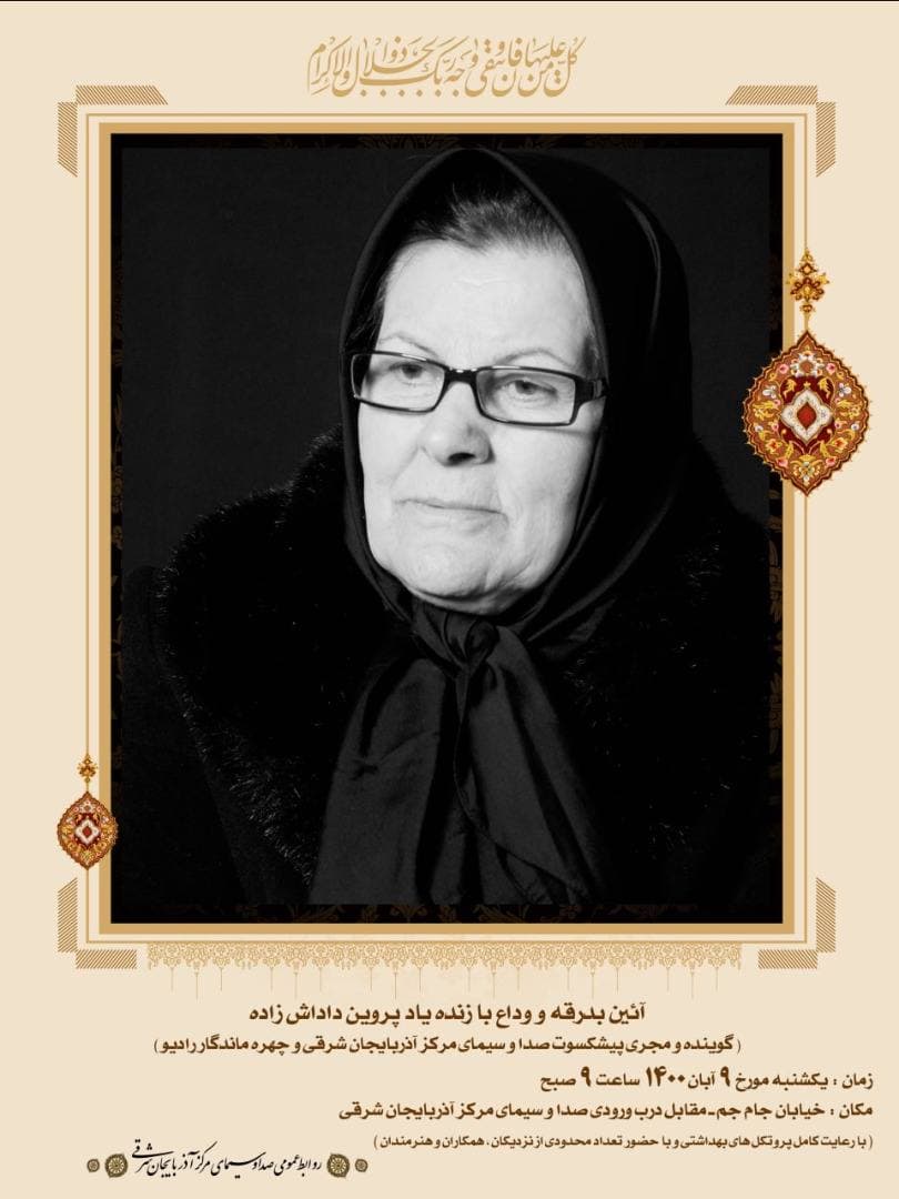 اما بهانهی این یادداشت ذکر خیری از گوینده پیشکسوت رادیو تبریز در دهه های ۴۰ تا ۸۰ ، زنده یاد شادروان سرکار خانم پروین داداش زاده که امروز شاهد تشییع پیکر آن هنرمند اندیشمند فقید در مراسم بدرقهی جام جم شهر هنرخیز تبریز هستیم؛ بوده است.