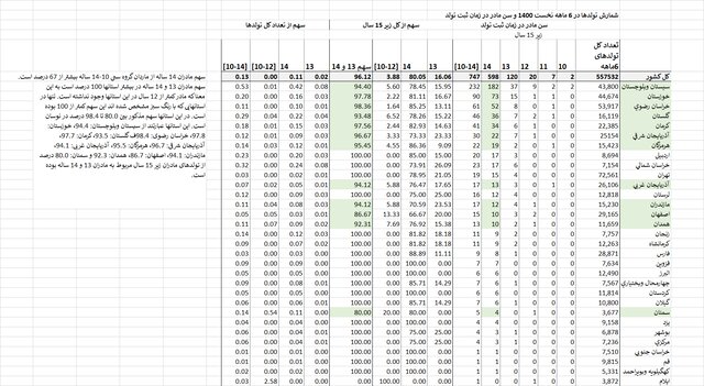همچنین طی شش ماهه نخست ۱۴۰۰، به ترتیب شش استان سیستان و بلوچستان، خوزستان، خراسان رضوی، گلستان، کرمان و آذربایجان شرقی استانهایی هستند که در آنها بیشترین ولادت کودکان از مادران ۱۰ تا ۱۴ ساله به ثبت رسیده است.