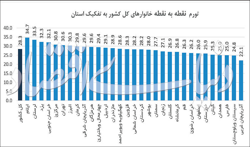 درصد تغییر شاخص کل نسبت به ماه مشابه سال قبل که معرف نرخ تورم است، برای خانوارهای شهری نیز ۳/ ۲۸ درصد ثبت شده است. بیشترین نرخ تورم نقطه به نقطه خانوارهای شهری مربوط به استان ایلام معادل ۳۴ درصد گزارش شده است. این در حالی است که کمترین میزان آن نیز مربوط به استان آذربایجان غربی در سطح ۲۳ درصد است.